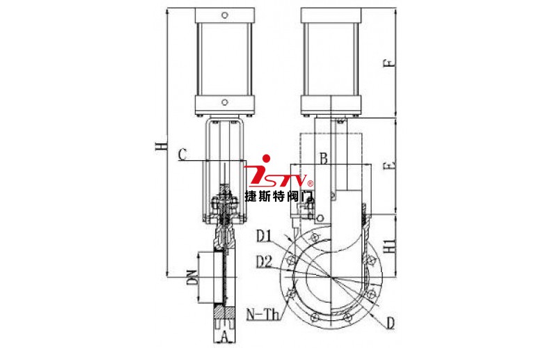 | DN | A | D | D1 | D2 | H | H1 | E | F | C | B | N-Th |